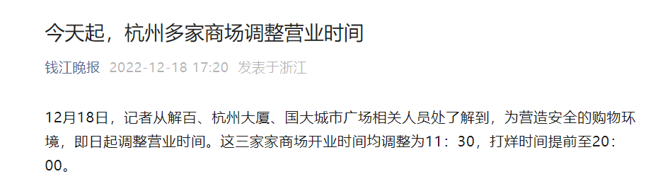 此外,12月18日錢(qián)江晚報(bào)報(bào)道,當(dāng)?shù)氐慕獍佟?a href=http://t.linkshop.com/kindex_id_1221.aspx target=_blank class=hotwords>杭州大廈、國(guó)大城市廣場(chǎng)等三家商場(chǎng)開(kāi)業(yè)時(shí)間調(diào)整為11點(diǎn)半,打烊時(shí)間提前至20點(diǎn)。
