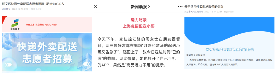近幾日,北京朝陽(yáng)區(qū)、豐臺(tái)區(qū)、順義區(qū)、大興區(qū)等多區(qū)域商務(wù)部門(mén)向居民發(fā)出倡議,公開(kāi)招募外賣(mài)配送人員,以應(yīng)對(duì)運(yùn)力不足壓力。
