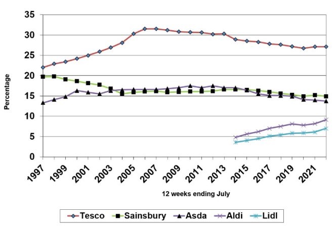 1997-2022年英國(guó)的超市零售商市場(chǎng)份額(圖源:Kantar官網(wǎng))