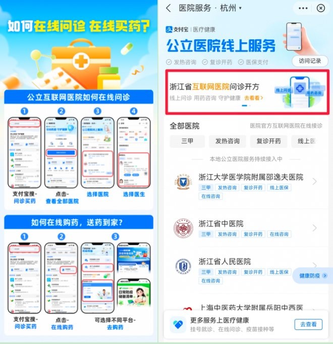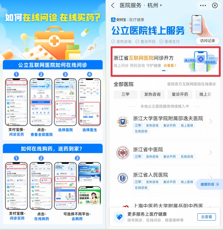 對(duì)普通人來說,最關(guān)心的就是:生病后如何便捷就醫(yī)?即日起,包括浙大邵逸夫醫(yī)院、浙江省人民醫(yī)院在內(nèi)的多家省級(jí)三甲醫(yī)院均已在支付寶、微信等平臺(tái)小程序開通在線咨詢、慢病復(fù)診、藥品配送等服務(wù),尤其針對(duì)近期防疫需求,部分醫(yī)院新增上線“新冠咨詢通道”。
