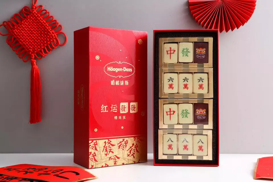 春節(jié)和情人節(jié)也同樣值得關(guān)注,2022年的虎年,哈根達(dá)斯將中國(guó)人過(guò)年的傳統(tǒng)娛樂(lè)活動(dòng)“打牌”融入其中,推出了“紅運(yùn)發(fā)發(fā)”精英版禮盒,外形精致小巧的12枚“麻將”由5種不同口味的冰淇淋組合而成,分別印有“六萬(wàn)”、“八萬(wàn)”、“中”、“發(fā)”和“虎頭”,寓意開(kāi)局必贏,演繹國(guó)潮文化的同時(shí)賺足了眼球?谖渡弦曰ǘ、水果為主,讓唇齒間充斥著春天的氣息。