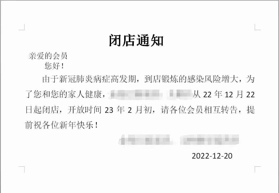 ▼這是杭州蕭山某健身房的提前閉店通知,已經(jīng)提前1個月閉店。
