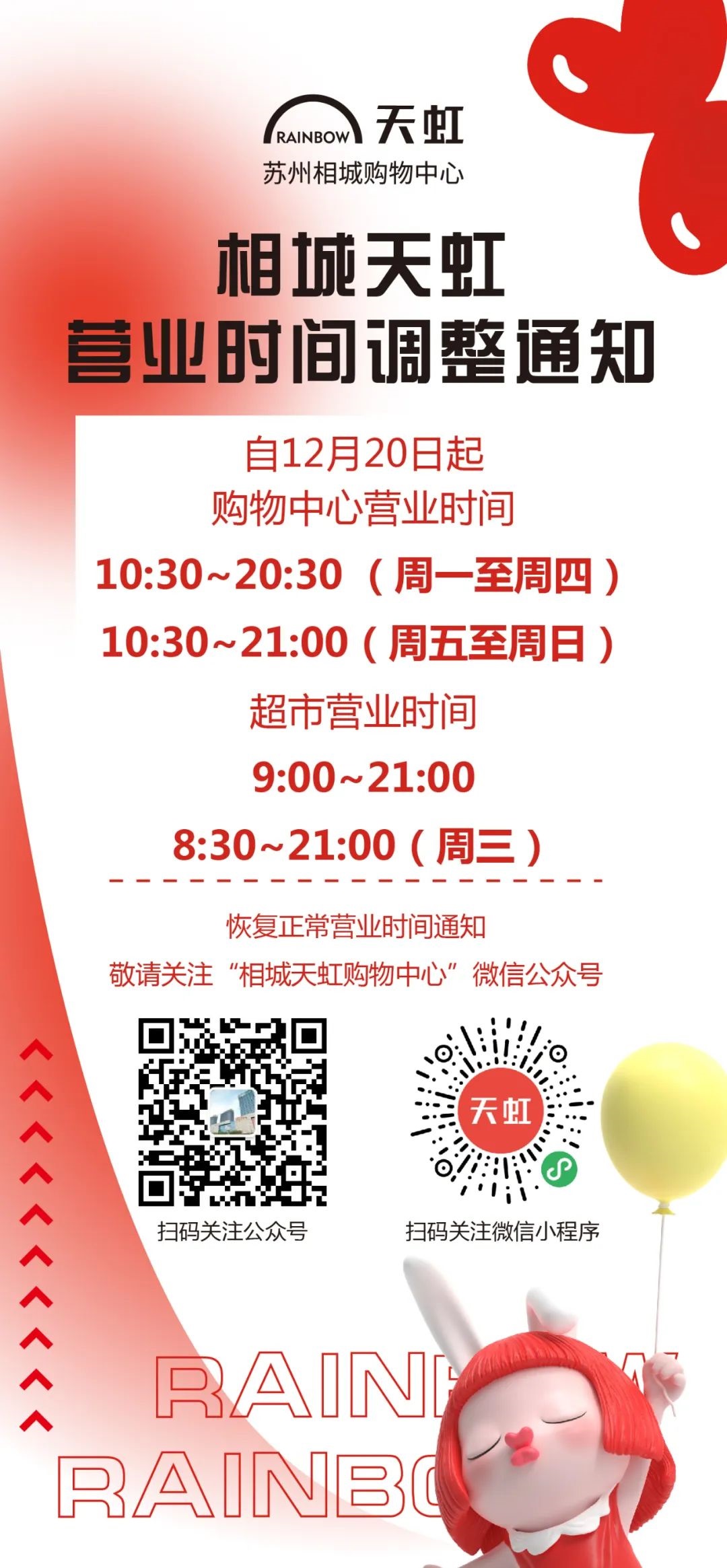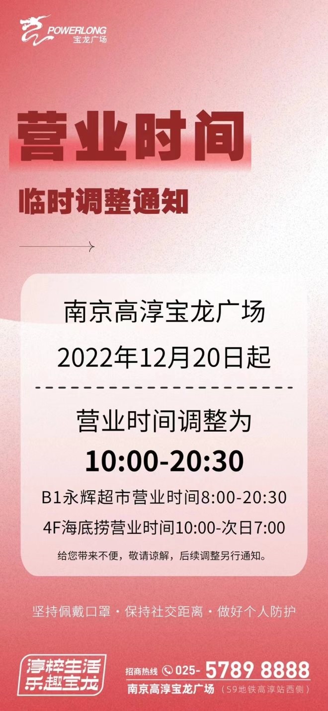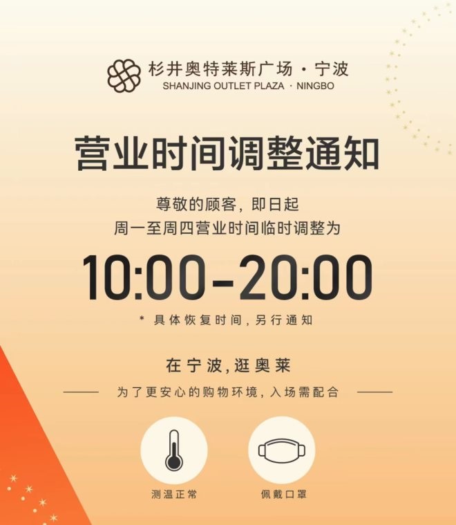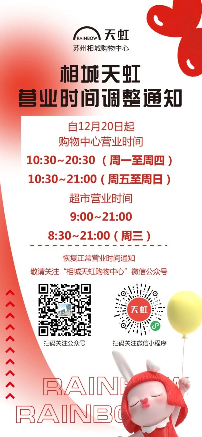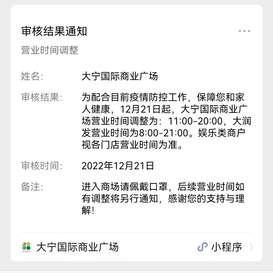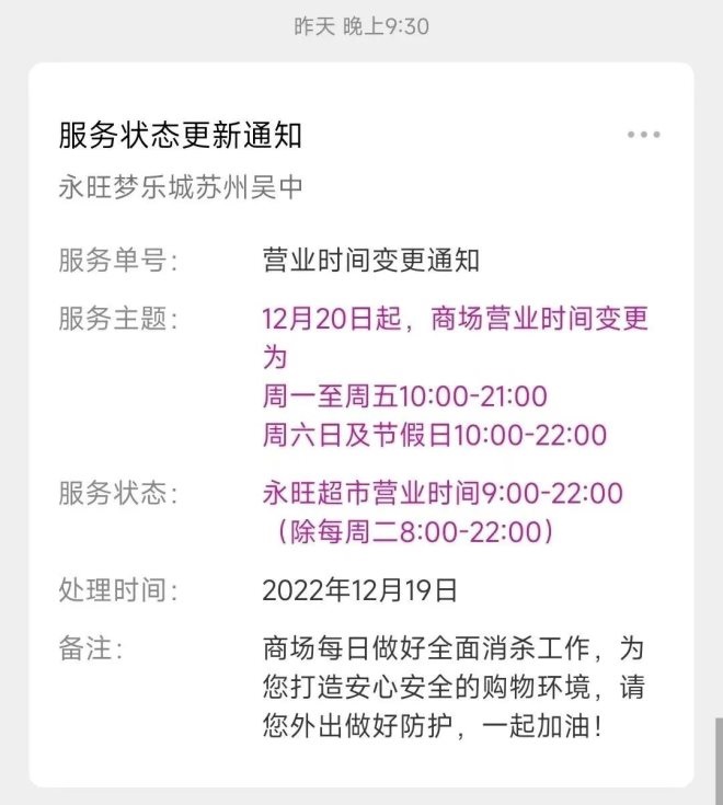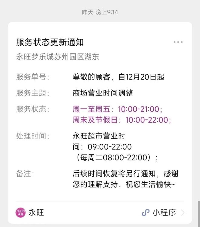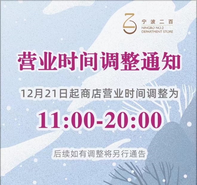 12月19日,砂之船(杭州)奧萊發(fā)布通知,即日起營業(yè)時(shí)間調(diào)整為10:30-20:00;杭州大廈501城市廣場發(fā)布通知稱,即日起營業(yè)時(shí)間暫時(shí)調(diào)整為11:00-20:30;不久后,西溪銀泰城發(fā)布通知,自12月20日起,除永輝超市等店鋪,營業(yè)時(shí)間將調(diào)整為11:00-21:00,后續(xù)營業(yè)時(shí)間恢復(fù)將另行通知;印力匯德隆奧體印象城自12月10日起調(diào)整營業(yè)時(shí)間,周一至周四為11:00至21:00,周五至周日:10:00至22:00。