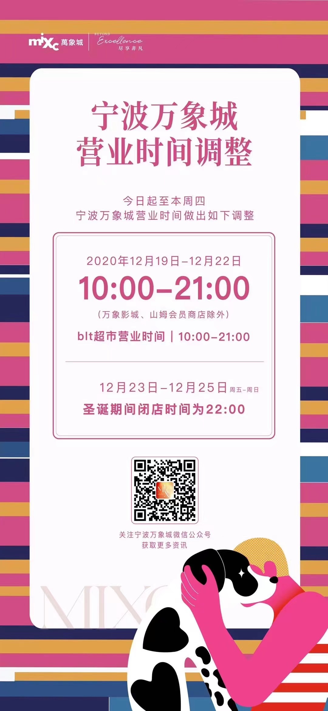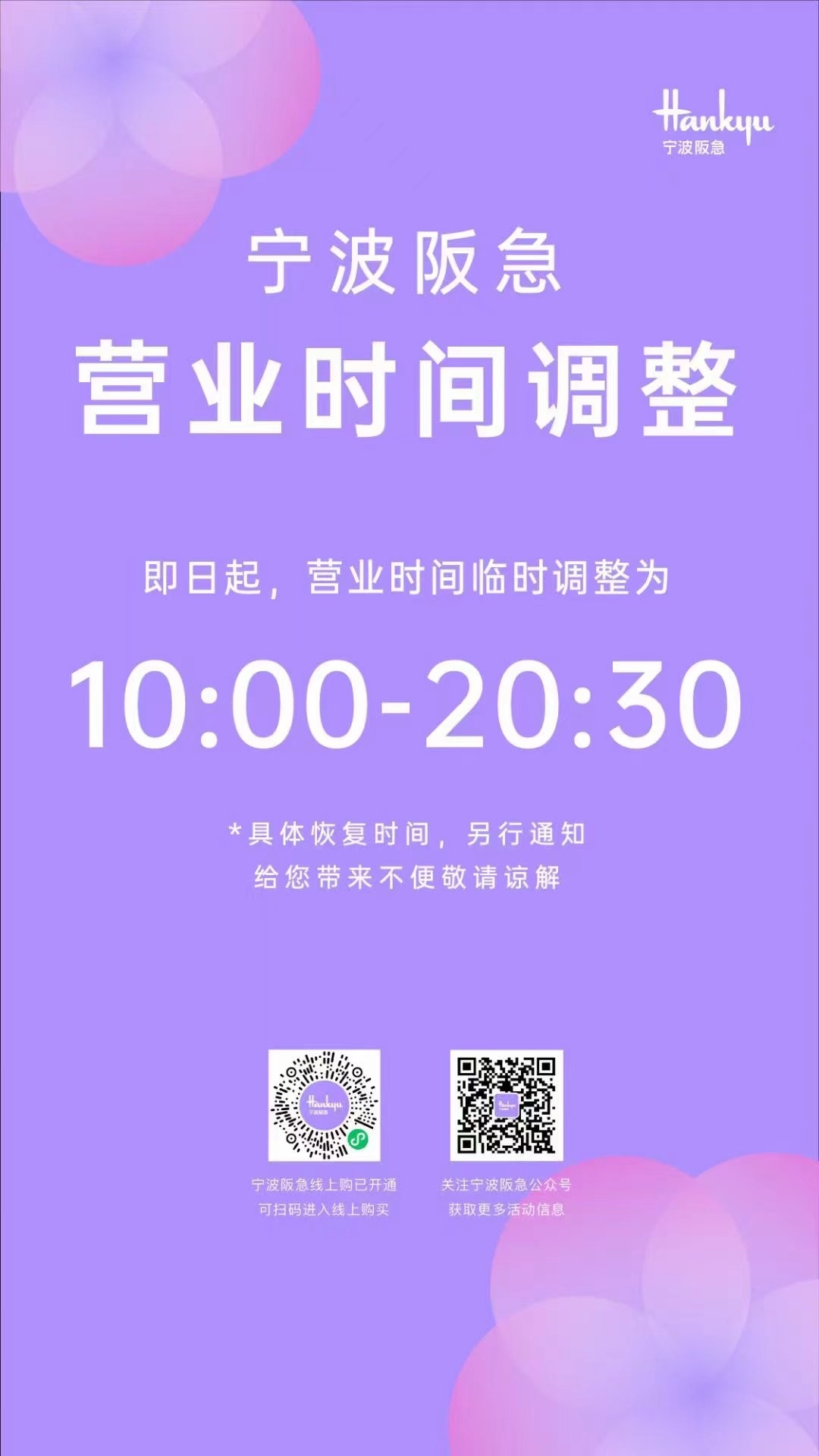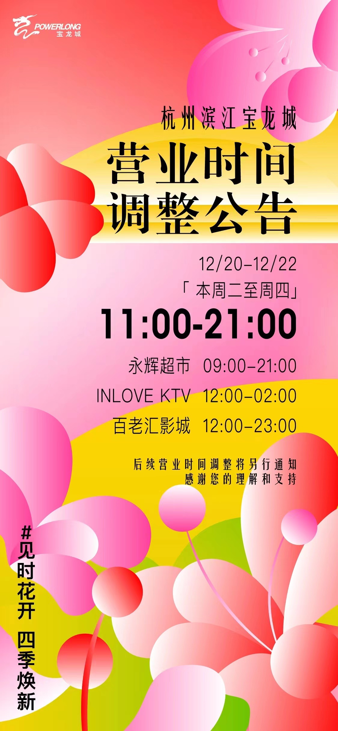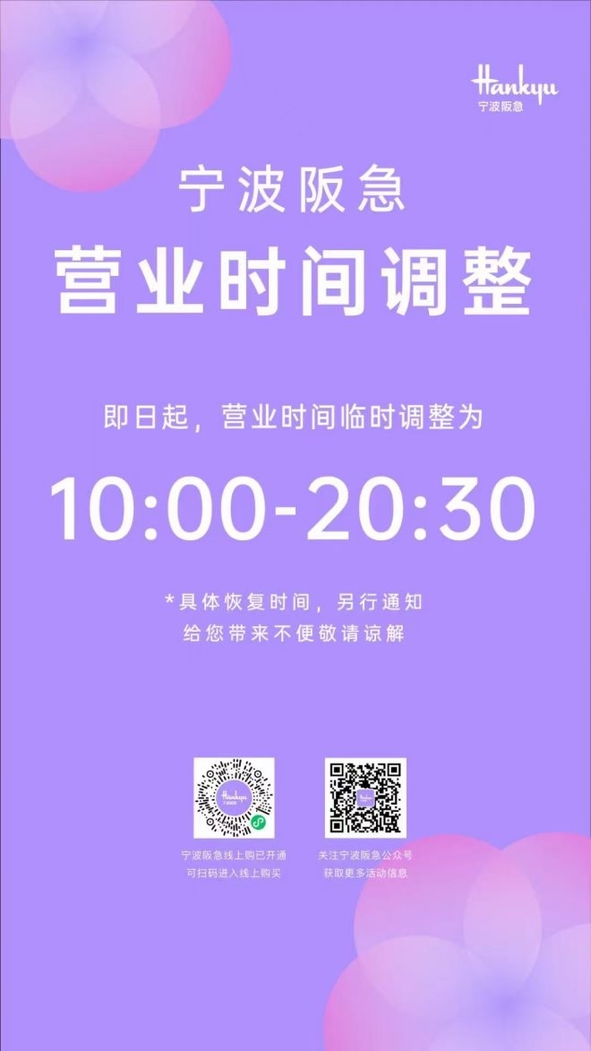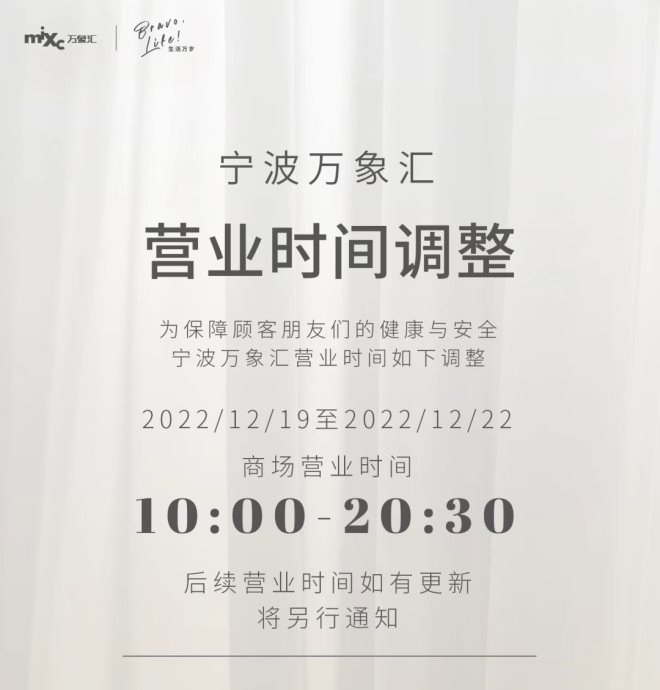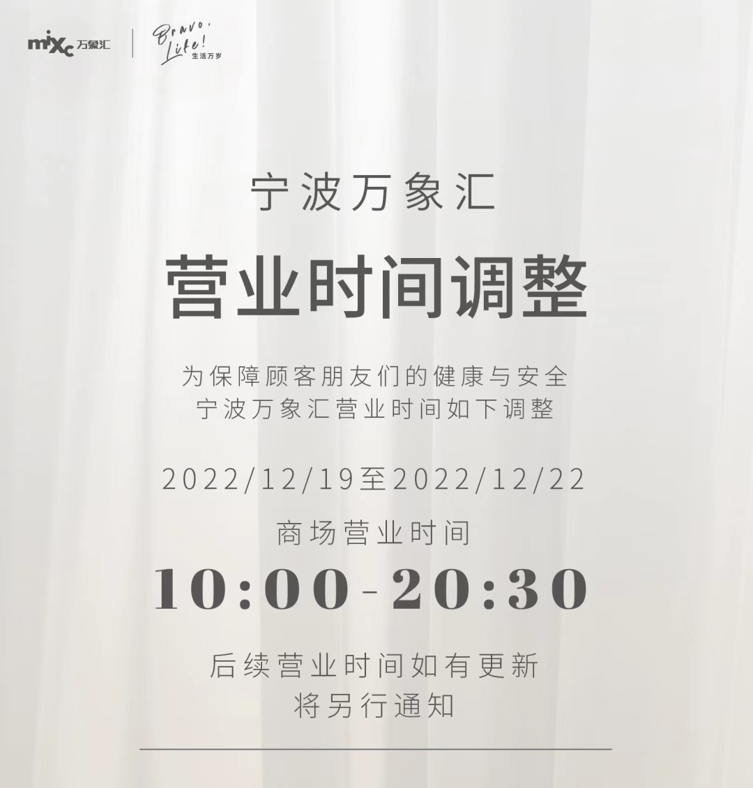 上午十點(diǎn),杭州萬象城發(fā)布通知稱,12月20日至12月22日將調(diào)整營業(yè)時(shí)間為11:00-20:00;杭州嘉里中心發(fā)布通知,自12月21日起,除南院、北巷餐飲商戶及Ole超市營業(yè)時(shí)間不變外,商場營業(yè)時(shí)間調(diào)整為11:00-20:00;古墩路印象城發(fā)布通知,自12月20日起調(diào)整營業(yè)時(shí)間,周一至周四:10:00至20:00,周五至周日:10:00至22:00;杭州科技城寶龍廣場發(fā)布通知,從今日開始,除京優(yōu)客超市(8:00-22:00)外,營業(yè)時(shí)間調(diào)整如下,周一至周日10:30-21:00;杭州蕭山萬象匯發(fā)布通知,12月20日止12月22日調(diào)整營業(yè)時(shí)間為11:00-20:00,盒馬超市正常營業(yè);杭州濱江寶龍城、杭州湖濱銀泰 in77發(fā)布通知,12月20日止12月22日調(diào)整營業(yè)時(shí)間為11:00-20:00;EFC LIVE歐美廣場發(fā)布通知稱,自12月21日起調(diào)整營業(yè)時(shí)間,周一至周五:10:30至21:00,周六至周日:11:00至21:00,同時(shí)還宣布取消原定于12月23日舉行的EFC LIVE歐美廣場“4周年慶”活動。