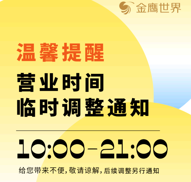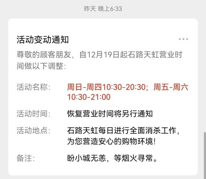 12月18日上午,杭州大廈發(fā)布通告宣布調(diào)整營業(yè)時(shí)間:即日起,杭州大廈營業(yè)時(shí)間調(diào)整至11:30-20:00,恢復(fù)營業(yè)時(shí)間將另行告知;12月18日晚,國大城市廣場宣布即日起,營業(yè)時(shí)間調(diào)整為11:30-20:00,后續(xù)營業(yè)時(shí)間變化將及時(shí)通知;西溪印象城發(fā)布通知稱,自12月19日起調(diào)整營業(yè)時(shí)間,周一至周四為11:00至21:00,周五至周日:10:00至22:00。