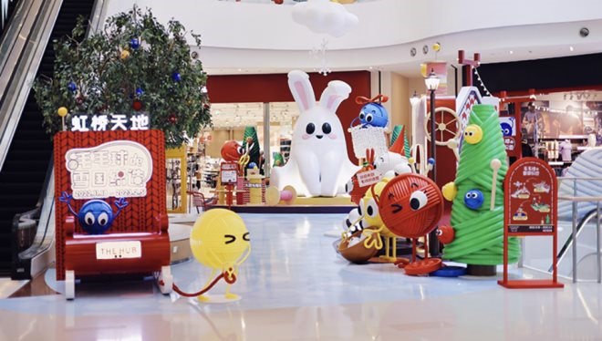 上海虹橋天地以原創(chuàng)IP毛線精靈為主人公,打造擬人化的形象和場景,傳遞幸福與溫情。一樓中庭的「毛線織造營」場景,設置了魔法雪橇、棉棉車縫間、滑雪大PK、織物暖陽、心愿喜兔五個陳設。