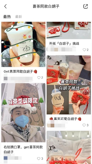 輕芝莓莓、輕芝莓莓桃靈感來自于喜茶于2017年推出的行業(yè)首款芝士果茶類產(chǎn)品芝芝莓莓。芝芝莓莓同樣也是行業(yè)內(nèi)首款芝士水果茶,通過芝士搭配真果,以冰沙、半冰沙形態(tài)的果茶產(chǎn)品更好地傳遞了水果的鮮感和風(fēng)味,令水果“真的可以喝”。芝士果茶產(chǎn)品后續(xù)也在行業(yè)內(nèi)得到了廣泛應(yīng)用,逐漸成為市場上最主要的水果茶產(chǎn)品品類。今年,喜茶輕芝莓莓等推出之后,網(wǎng)友們將45度大口喝喜茶的經(jīng)典飲用方式與圣誕氛圍相結(jié)合,紛紛下單飲品并解鎖#喜茶同款白胡子#的拍照姿勢。
