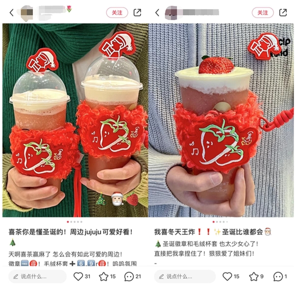 冬日草莓季來臨,喜茶“時令鮮果”系列上新輕芝莓莓、輕芝莓莓桃兩款產(chǎn)品,這是喜茶連續(xù)第三年圍繞“草莓真果”推出新品,為消費者帶來真果制作的當(dāng)季新鮮風(fēng)味。其中,輕芝莓莓桃上新首日就登上銷售榜首,成為冬季人氣飲品。同時,喜茶結(jié)合越來越濃厚的圣誕氛圍推出圣誕莓莓季系列活動,上線圣誕阿喜毛絨徽章、真果草莓毛絨杯套等周邊,傳遞節(jié)日喜悅氛圍,也因此受到許多消費者喜愛。