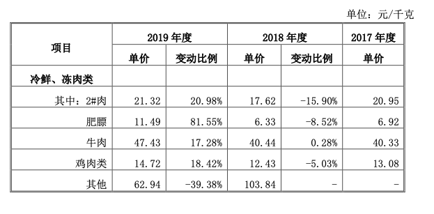 同時間段內(nèi),肉的單價由2018年的17.62元增加到2019年的21.32元。這意味著,巴比食品的采購會受到物價周期性浮動影響。