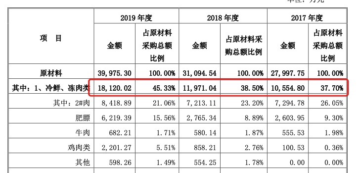 最典型的如豬肉。在巴比食品招股書中的采購列表看到,2017年至2019年,巴比食品采購的冷鮮、冷凍類原材料占比分別為37.7%、38.5%、45.33%。