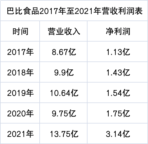 從財務(wù)數(shù)據(jù)看到,巴比饅頭從2017年至2021年,每年營收分別為8.67億、9.9億、10.64億、9.75億和13.75億,對應(yīng)的凈利潤為1.13億、1.43億、1.54億、1.75億、3.14億。