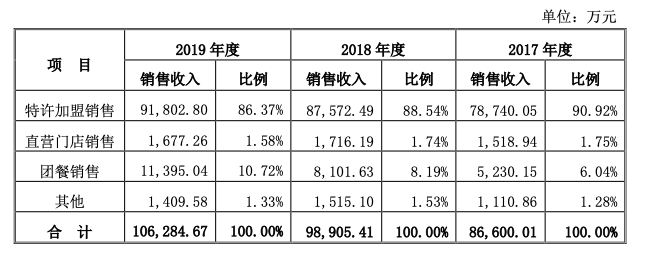 2017年至2019年,團(tuán)餐銷售收入分別為5230.15萬、8101.63萬、1.14億,占總收入比重分別為6.04%、8.19%、10.72%。