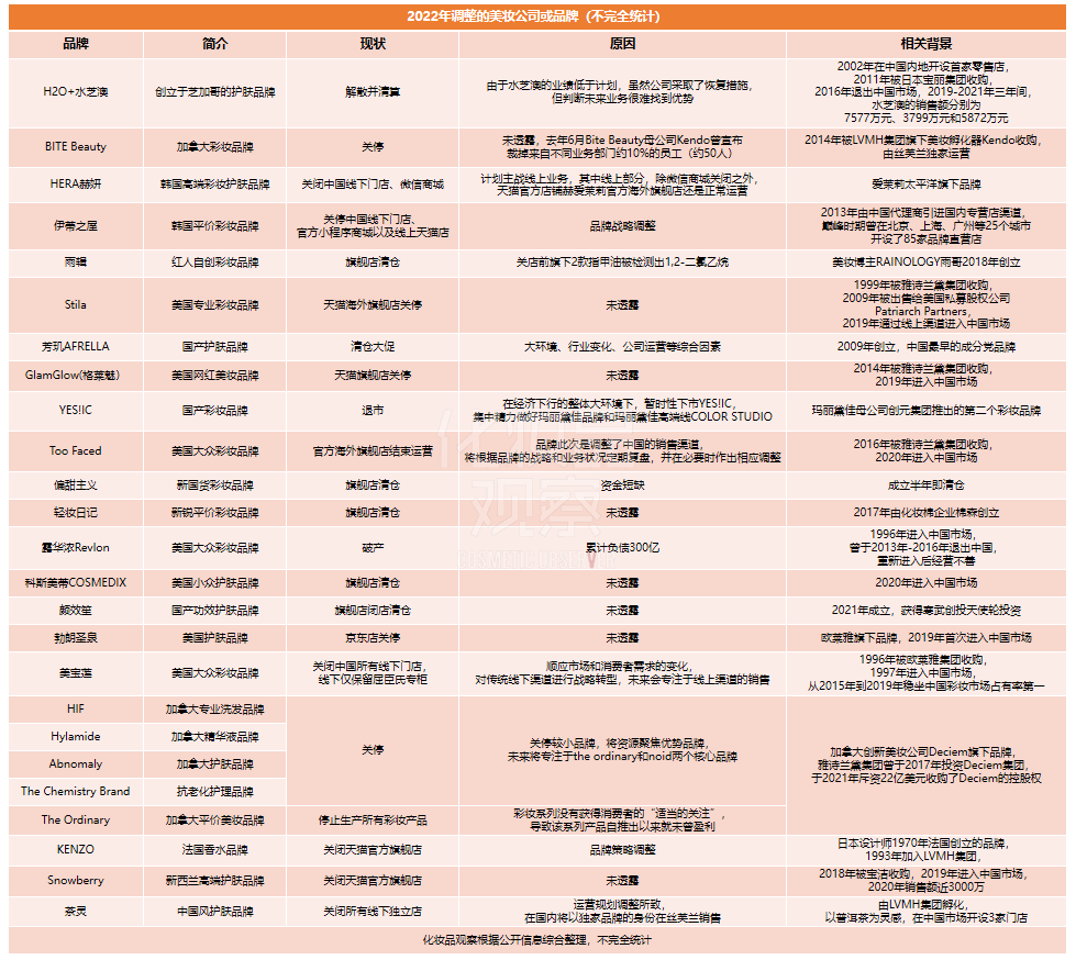 而美妝行業(yè)持續(xù)受創(chuàng),2022年一批新的品牌倒閉和消失。經化妝品觀察初步統(tǒng)計,今年不少于25個美妝品牌相繼敗退甚至“倒下”,近三年則有上百個品牌“死傷慘重”。
