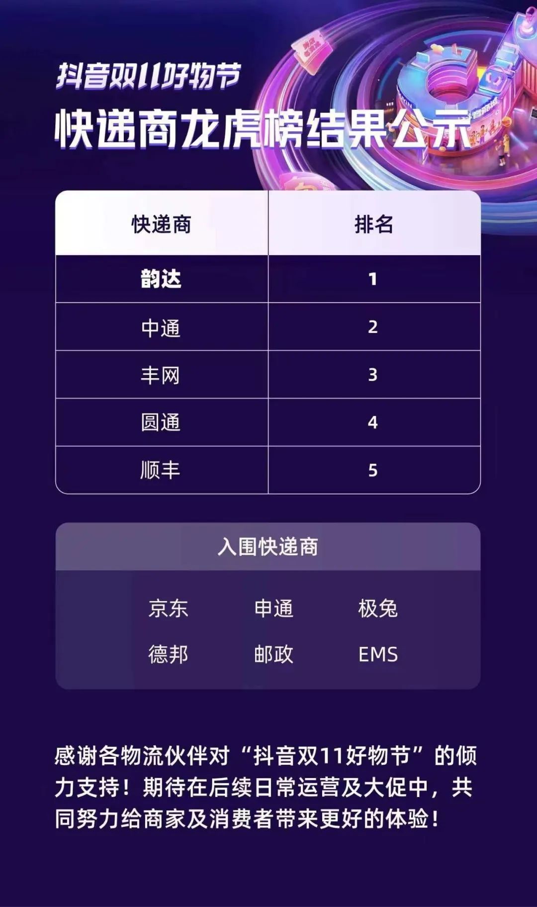 11月下旬,抖音發(fā)布的一份“雙11好物節(jié)”快遞服務(wù)商龍虎榜顯示,韻達(dá)排名第一,中通、豐網(wǎng)、圓通、順豐位列前5名,京東、極兔、郵政、申通、德邦等快遞企業(yè)入圍。
