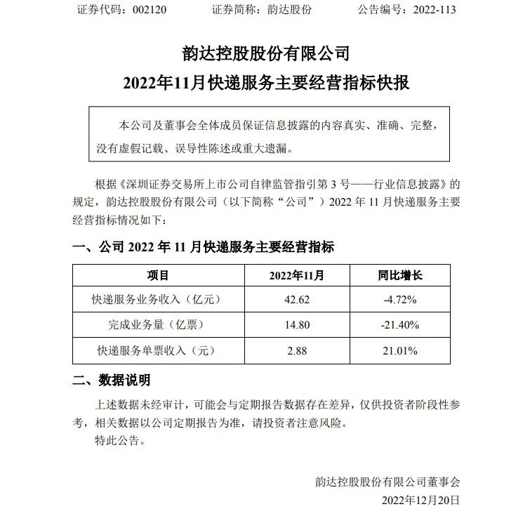 12月19日,順豐控股、圓通速遞、申通快遞、韻達(dá)股份四大公司發(fā)布了2022年11月快遞物流業(yè)務(wù)經(jīng)營(yíng)簡(jiǎn)報(bào)。