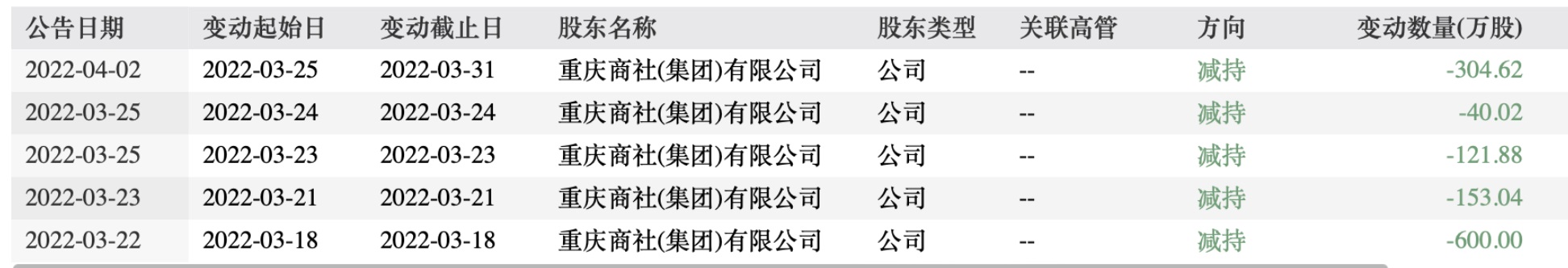 此外,時代財經(jīng)注意到,重慶商社自今年3月份起便開始減持重慶百貨。