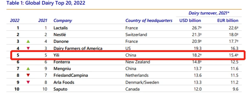 根據(jù)荷蘭合作銀行所發(fā)布的“全球乳業(yè)20強”排行榜,2021年,伊利以182億美元的營業(yè)額在全球乳業(yè)中排名第五,法國蘭特黎斯Lactalis、瑞士雀巢、法國達能集團分別以267億美元、213億美元及209億美元的銷售額排名前三位。