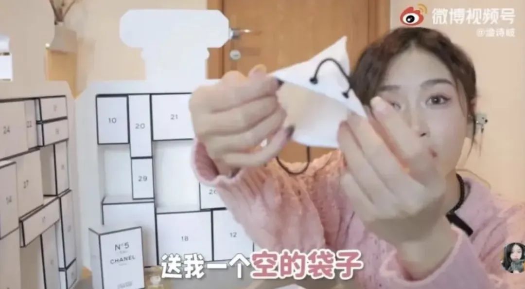 不止一個博主從價值800美元(人民幣6000塊)的禮盒里倒計時第九天那格拆出印著香奈兒logo的黑白貼紙。整套禮盒里只有6件正經(jīng)產(chǎn)品,其他的都是所謂貼紙、空袋子等周邊,“6000元大洋就買了一堆邊角料”點燃看客的吐槽熱情,美妝博主爭相當(dāng)香奈兒的冤大頭,拆同款盲盒吸引火力。