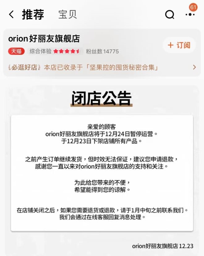 12月23日,orion好麗友旗艦店發(fā)布閉店公告,將于12月24日暫停運營,并于12月23日下架店鋪所有產(chǎn)品。