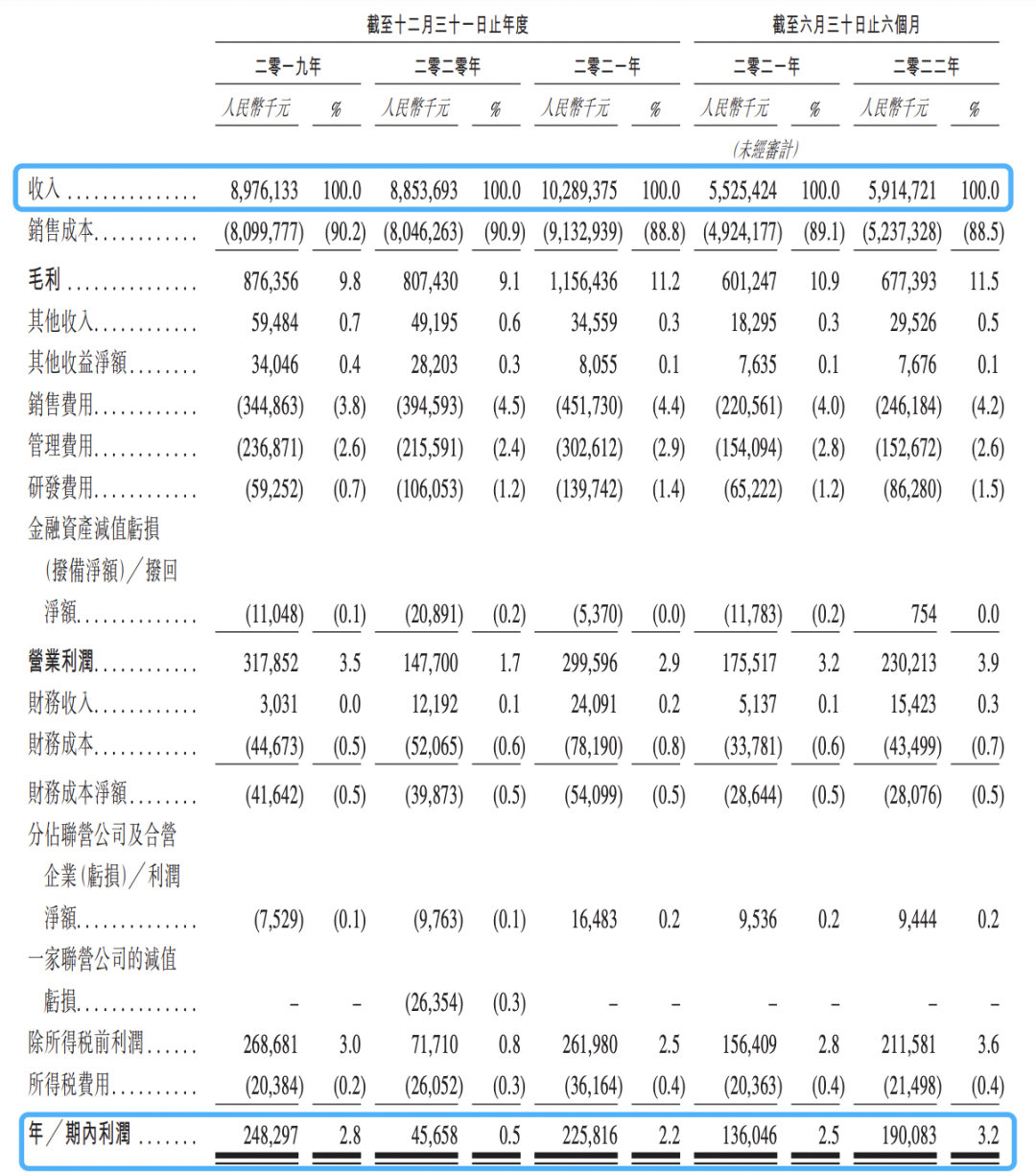 根據(jù)招股書,2019-2021年,百果園的收入分別為89.76億元、88.53億元、102.89億元,同期毛利率分別為9.8%、9.1%及11.2%,整體并不高;凈利潤分別為2.48億元、0.46億元、2.26億元。
