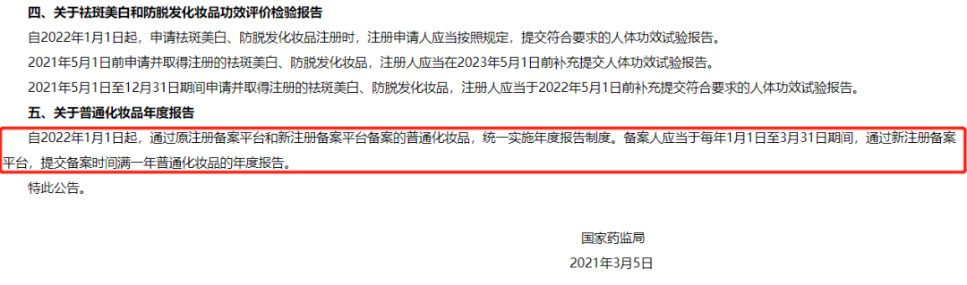 根據(jù)《國家藥監(jiān)局關(guān)于實(shí)施<化妝品注冊(cè)備案資料管理規(guī)定>有關(guān)事項(xiàng)的公告》,備案人應(yīng)當(dāng)于2023年1月1日至3月31日期間,通過新注冊(cè)備案平臺(tái),提交備案時(shí)間滿一年普通化妝品的年度報(bào)告。