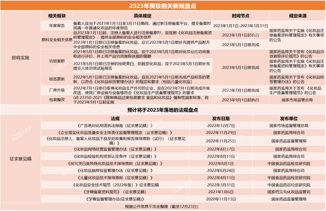 與此同時(shí),《企業(yè)落實(shí)化妝品質(zhì)量安全主體責(zé)任監(jiān)督管理規(guī)定(征求意見稿)》等十余部新規(guī)呼之欲出,大概率將在2023年落地執(zhí)行,這意味著,美妝企業(yè)頭上的“緊箍咒”將進(jìn)一步收緊。