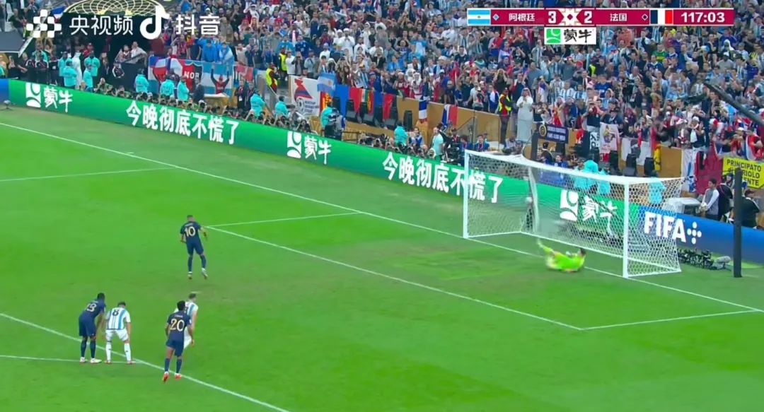 世界杯決賽下半場阿根廷與法國3-2,姆巴佩點球,全球觀眾緊張地屏住呼吸時,蒙牛的場邊廣告“今晚徹底不慌了”突然出現,強烈反差在社交媒體上引起大量討論,無數網友把這張廣告語玩出了花:“今晚梅西慌得很”、“今晚差點慌了”。