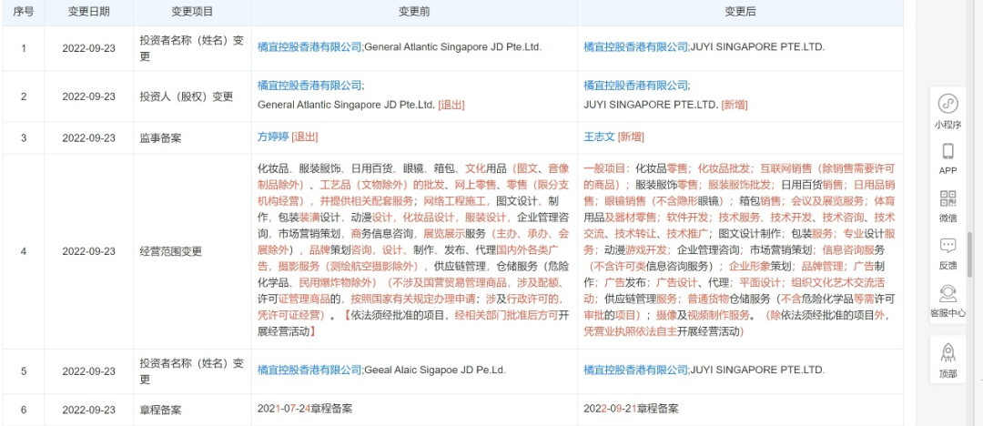 「子彈財觀」發(fā)現(xiàn),除了去年7月、9月發(fā)生股權(quán)變更外,今年9月,橘宜還發(fā)生了一系列股權(quán)變更,2022年9月23日,泛大西洋資本退出,橘宜集團(tuán)控股股東變更為橘宜香港和橘宜新加坡。