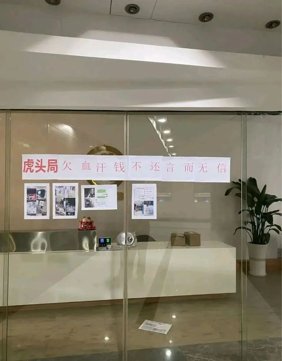 受影響的不止是產(chǎn)品,虎頭局位于廣州珠江新城的辦公室門口還被貼上了拖欠裝修款的大字報(bào)。從微信截圖可以隱約看出,工程方要求虎頭局結(jié)清深圳壹方天地門店、廣州百信廣場(chǎng)門店的工程款。