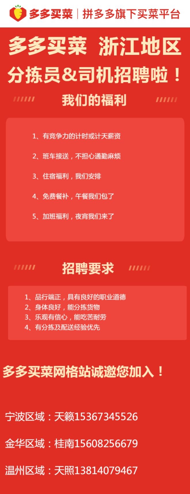 為切實(shí)滿足群眾日常生活,浙江多多買菜做好糧食蔬菜、民生物資等保供穩(wěn)價(jià)同時(shí),確保產(chǎn)運(yùn)銷等各環(huán)節(jié)銜接有序,暢通社區(qū)團(tuán)購最后一公里。為此,浙江地區(qū)多多買菜在嘉興(海寧)、寧波、溫州、金華等地提供上百個(gè)高薪崗位,倡議有閑暇時(shí)間的市民,在自身?xiàng)l件允許的情況下,共同參與保障市民“菜籃子”的工作中。