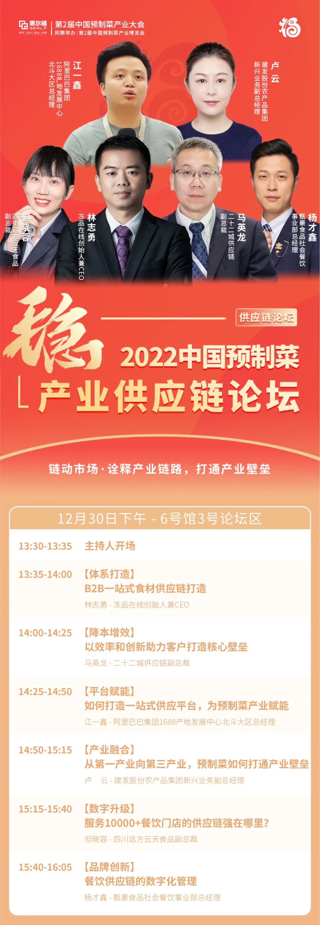 以上嘉賓將從供應(yīng)鏈及預(yù)制菜當前市場需求趨勢出發(fā),圍繞產(chǎn)業(yè)融合、數(shù)字升級、資本視角、品牌營銷等展開話題探討,深入探尋餐飲供應(yīng)鏈和預(yù)制菜的賽道交點!