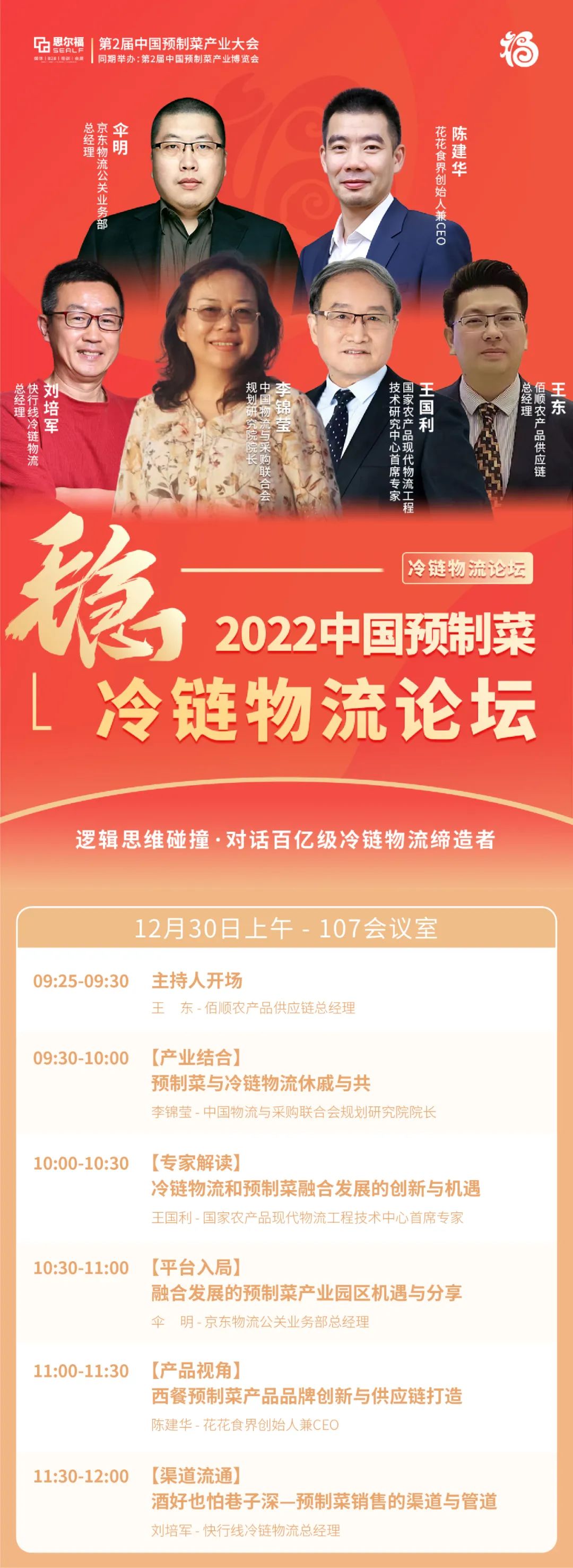 本次論壇我們邀請到了:1、中國物流與采購聯(lián)合會規(guī)劃研究院李錦瑩院長;2、國家農(nóng)產(chǎn)品現(xiàn)代物流工程技術(shù)研究中心首席專家王國利先生;3、“運營超1400個倉庫、倉儲總面積約2600萬平方米”的京東物流公關(guān)業(yè)務(wù)部總經(jīng)理傘明;4、“成立一年便融資數(shù)千萬,推出單品70余款”的花花食界創(chuàng)始人兼CEO陳建華;5、“實現(xiàn)43個城市50000個超市的冷鏈生鮮配送”的快行線冷鏈物流總經(jīng)理劉培軍;6、“與全國17個骨干冷鏈物流基地進行對接形成預(yù)制菜流通服務(wù)網(wǎng)絡(luò)”的佰順農(nóng)產(chǎn)品供應(yīng)鏈總經(jīng)理王東。