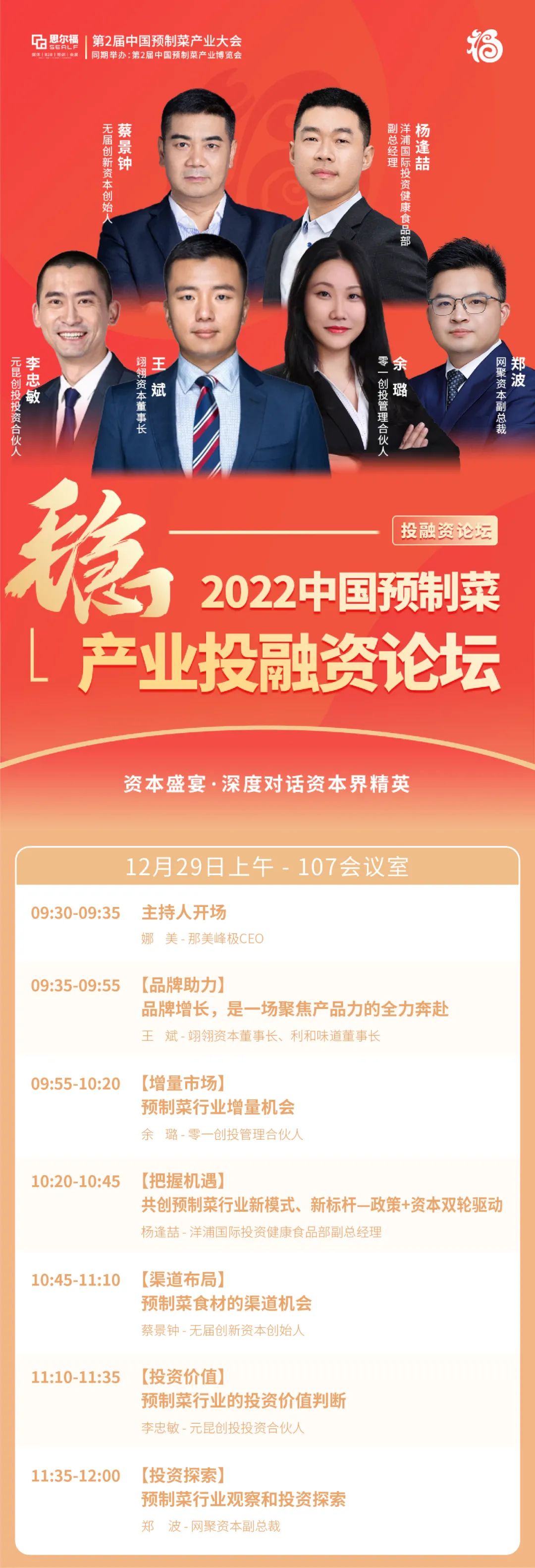 本次論壇我們邀請到了:1、“完成D輪融資,業(yè)務(wù)連續(xù)三年翻倍增長”的翊翎資本、利和味道董事長王斌;2、“擁有10年早期投資經(jīng)驗,參與超過90個項目的投資決策和投后管理工作”的零一創(chuàng)投管理合伙人余璐;3、“長期專注于產(chǎn)業(yè)發(fā)展及研究領(lǐng)域”的洋浦國際投資健康食品部副總經(jīng)理楊逢喆;4、“曾任銀河系創(chuàng)投創(chuàng)始合伙人、沃爾瑪(中國)、華潤集團財務(wù)高管”的無屆創(chuàng)新資本創(chuàng)始人蔡景鐘;5、“國內(nèi)第二大商業(yè)綜合體世紀金源集團旗下、致力于新消費領(lǐng)域投資的CVC機構(gòu)”元昆創(chuàng)投投資合伙人李忠敏;6、“絕味食品旗下的產(chǎn)業(yè)投資平臺,定位于成為“特色食品和輕餐飲的加速器”的網(wǎng)聚資本副總裁鄭波。