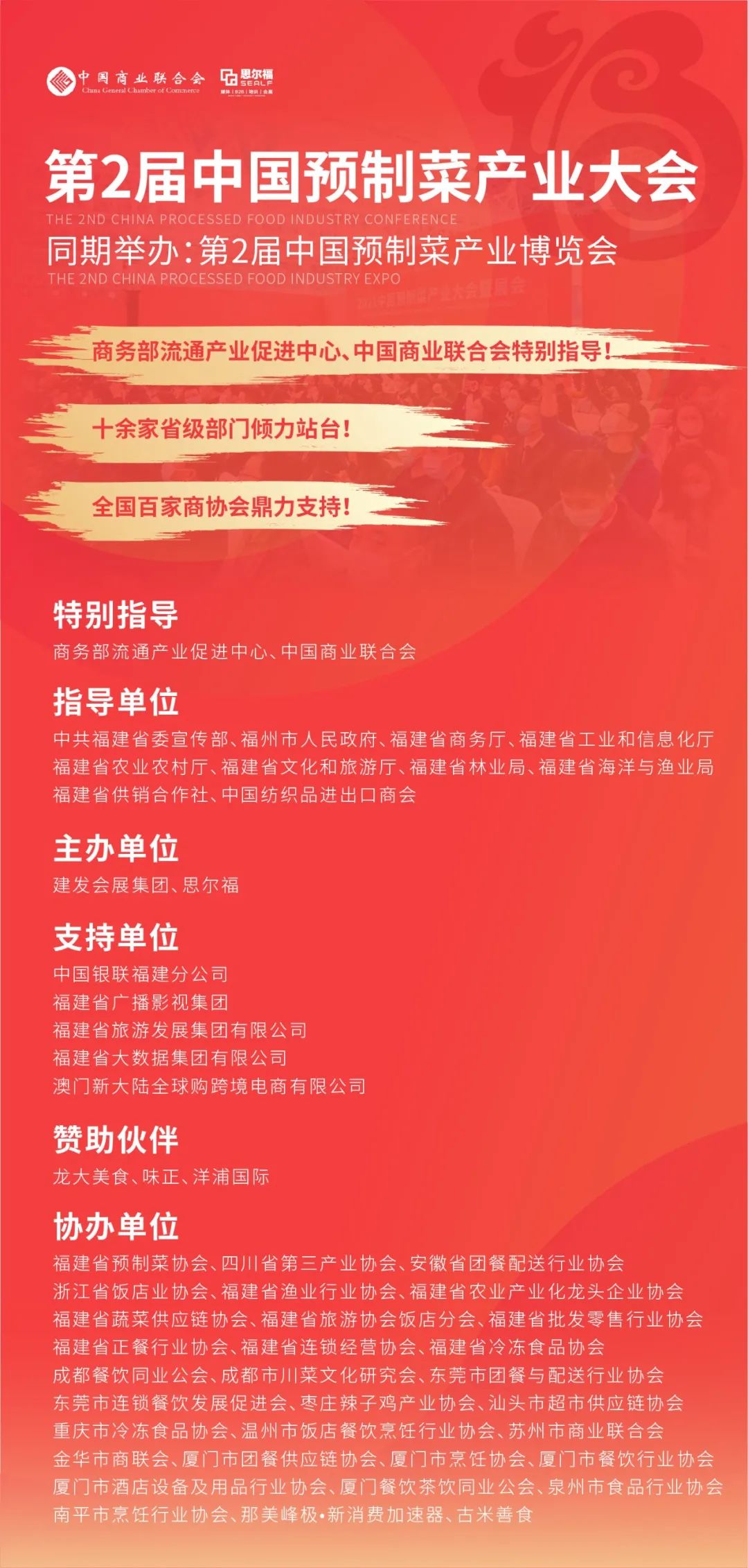第2屆中國預(yù)制菜產(chǎn)業(yè)大會、第2屆中國預(yù)制菜產(chǎn)業(yè)博覽會將于12月29日-31日在福州海峽國際會展中心舉行,30000m2展覽規(guī)模、500+國內(nèi)頭部品牌、近10000種預(yù)制菜新品,聚焦全球前沿、緊扣產(chǎn)業(yè)脈搏、100余位國家級專家、知名企業(yè)實戰(zhàn)分享、100余家商協(xié)會、近5萬名行業(yè)人士共襄盛宴,打造中國預(yù)制菜行業(yè)第一盛會!