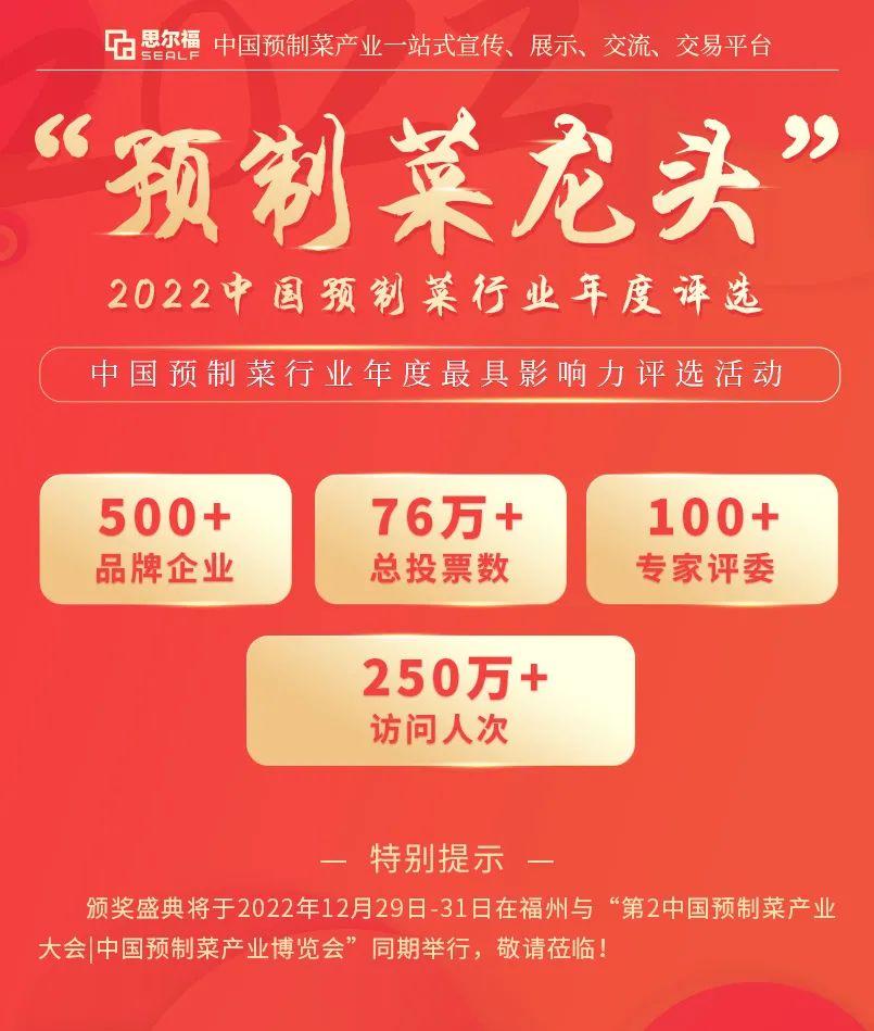 獎項范圍實現(xiàn)水產(chǎn)品預(yù)制菜、肉禽預(yù)制菜、凈菜、復(fù)合調(diào)味料、設(shè)計包裝、機械設(shè)備等預(yù)制菜產(chǎn)業(yè)上下游企業(yè)全品類覆蓋,是國內(nèi)預(yù)制菜行業(yè)最全面、最專業(yè)、最具影響力,并為業(yè)界唯一認可的預(yù)制菜行業(yè)評選活動。最終,近500家國內(nèi)預(yù)制菜品牌企業(yè)積極參評,總投票數(shù)超76萬張,訪問量突破250萬人次!12月29日齊聚福州,讓我們見證年度“預(yù)制菜龍頭”的誕生!