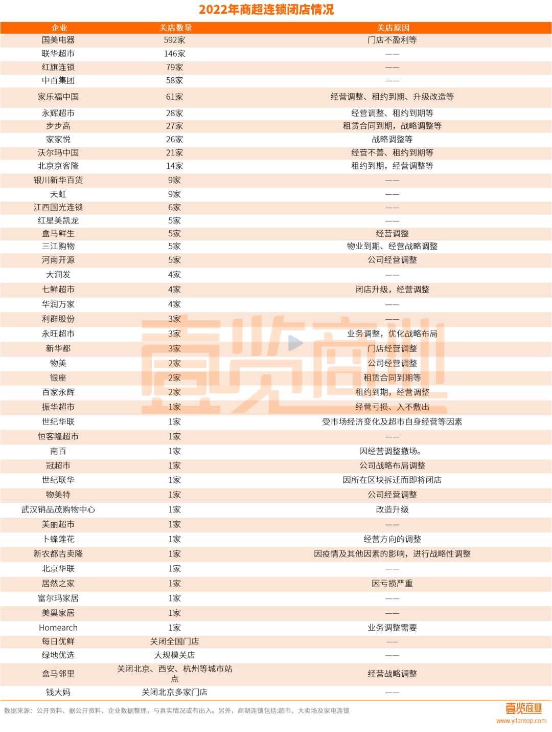 據(jù)壹覽商業(yè)統(tǒng)計(jì),2022年,商超行業(yè)中有至少1138家門店宣布關(guān)閉,覆蓋46家企業(yè)。其中,國(guó)美零售關(guān)店近600家、聯(lián)華超市關(guān)店146家、紅旗連鎖關(guān)店79家、家樂(lè)福關(guān)店54家、沃爾瑪關(guān)店21家等等。