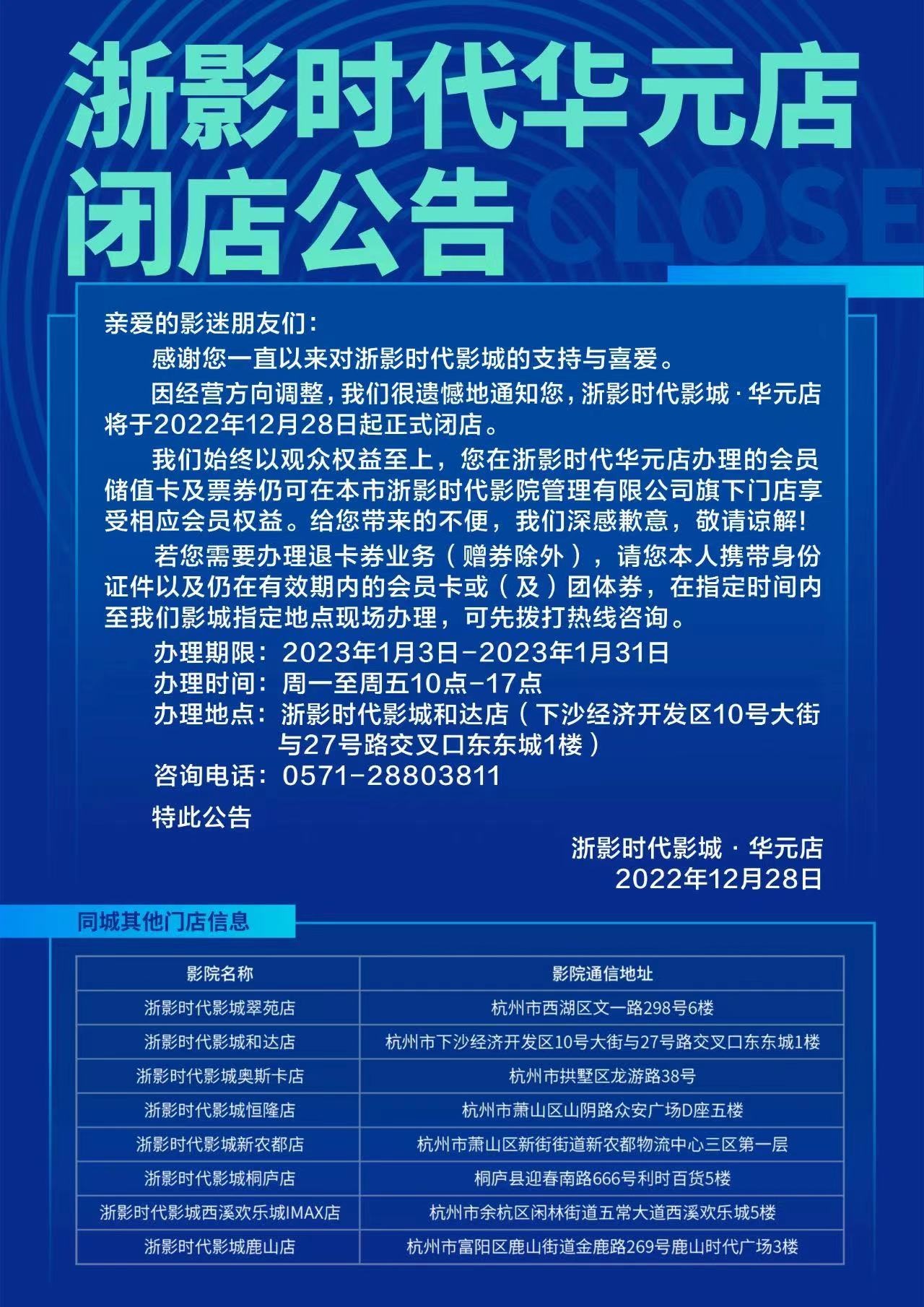 公告稱,因經(jīng)營(yíng)方向調(diào)整,浙影時(shí)代華元店將于2022年12月28日起正式閉店。如有會(huì)員儲(chǔ)值卡和消費(fèi)券的可至浙影時(shí)代旗下其他影院消費(fèi),也可以選擇退卡。