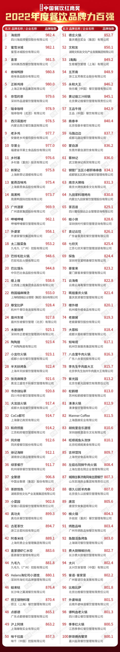2022年度餐飲品牌力百強
