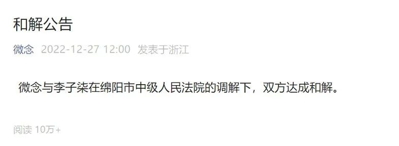 12月27日,微念公眾號發(fā)布聲明:“微念與李子柒在綿陽市中級人民法院的調(diào)解下,雙方達成和解。”