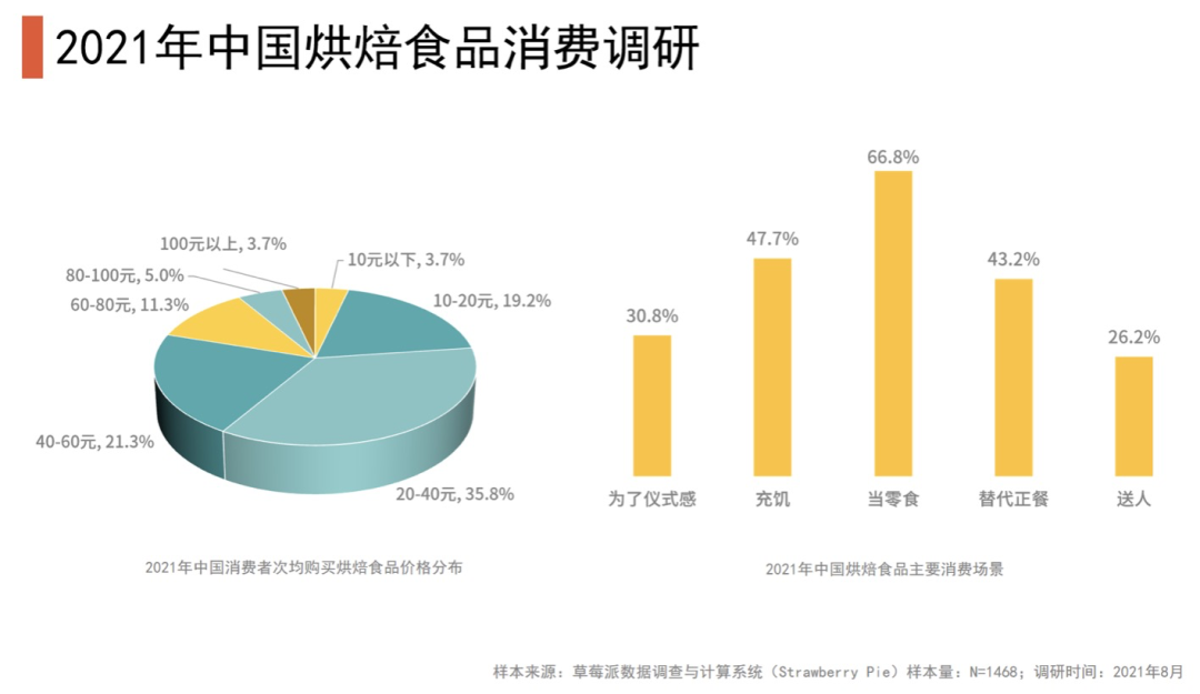 此外,艾媒咨詢在《2021年中國烘焙食品行業(yè)競爭格局與消費行為分析報告》中指出:2021年中國烘焙行業(yè)市場規(guī)模達2600.8億元,同比增長19.9%。2023年預計將突破3000億元。且在烘焙的各種消費場景中,66.8%的消費者將其當作零食;作為充饑和正餐替代品則位居第二,占比達47.7%。