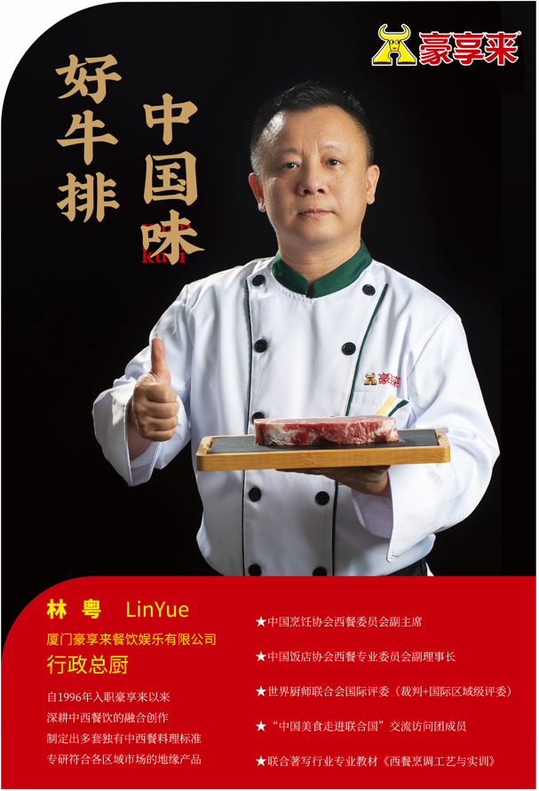 豪享來行政總廚林粵先生自1996年入職以后,就深耕中西餐飲的融合創(chuàng)作,制定出多套獨有的中西餐料理標準,專研符合各區(qū)域市場的地緣產(chǎn)品。林粵先生作為中國烹飪協(xié)會西餐委員會副主席、中國飯店協(xié)會西餐專業(yè)委員會副理事長、世界廚師聯(lián)合會國際評委(裁判+國際區(qū)域級評委)、“中國美食走進聯(lián)合國”交流訪問團成員,還曾聯(lián)合著寫行業(yè)專業(yè)教材《西餐烹調(diào)工藝與實訓(xùn)》,在餐飲及預(yù)制菜板塊上擁有資深經(jīng)驗和實際成果。