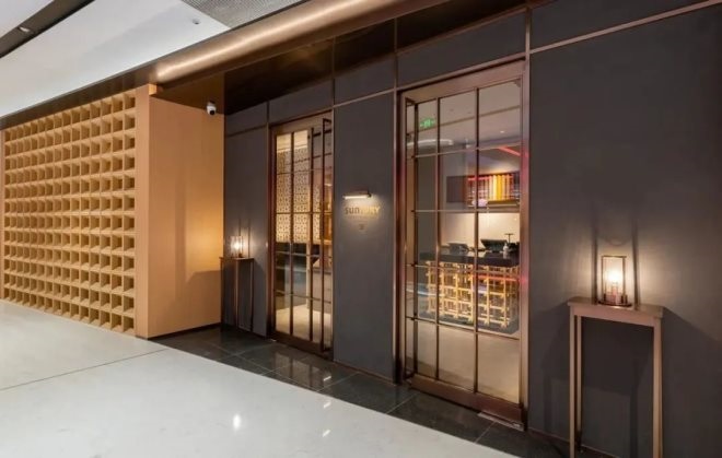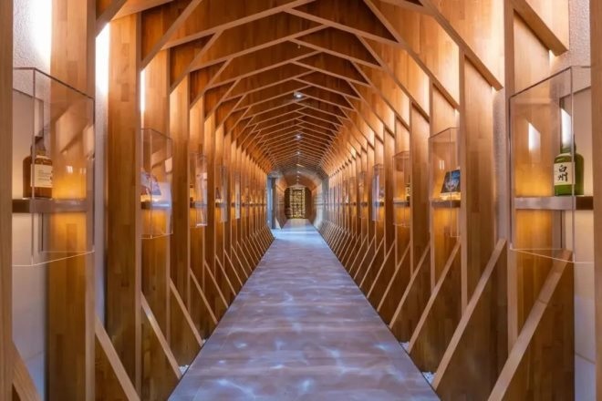首店分為高級(jí)日料餐廳、威士忌酒吧、露臺(tái)酒廊三個(gè)功能分區(qū),光與影交相輝映的威士忌隧道流動(dòng)著藍(lán)色水波紋,視覺效果夢幻浪漫,走廊兩邊則擺放著三得利的各種藏品,威士忌隧道旁還有一個(gè)藏有上千瓶好酒的葡萄酒酒窖。