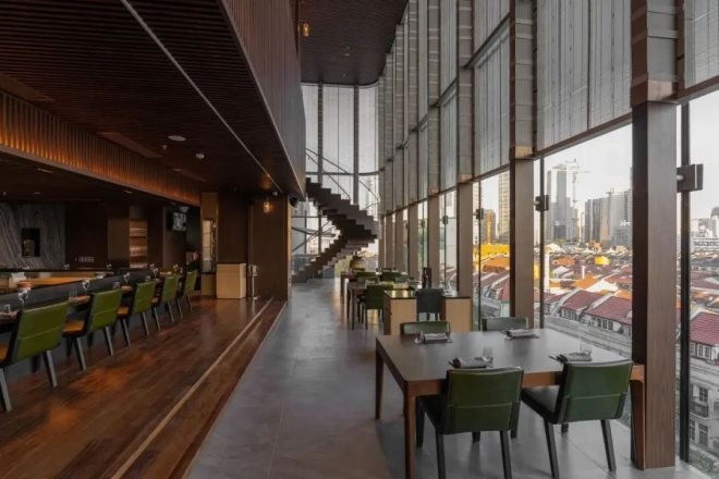 餐廳里全落地窗的設(shè)計(jì)以及超高用餐空間,開放式且具有日式傳統(tǒng)的料理吧臺(tái),視野極佳的窗前散座區(qū),整體布局溫馨大氣。