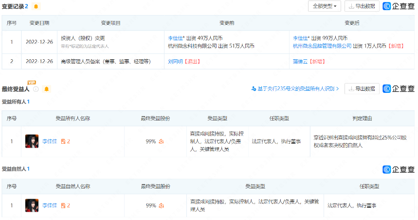 在公開達成和解的前一天,四川子柒文化傳播有限公司的高級管理人員備案發(fā)生了變動,劉同明退出,蒲倩云新增,李佳佳出資99萬人民幣,最終擁有了該公司99%的表決權(quán)和受益股份。