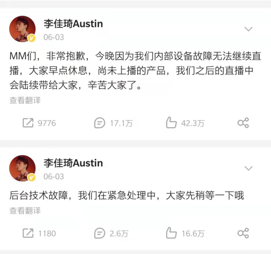6月3日,正在進(jìn)行的李佳琦直播間突然中斷。隨即,李佳琦發(fā)微博解釋稱后臺出現(xiàn)技術(shù)故障。一天后,李佳琦接下來幾天的直播預(yù)告消失,淘寶也下架了李佳琦直播間的入口。