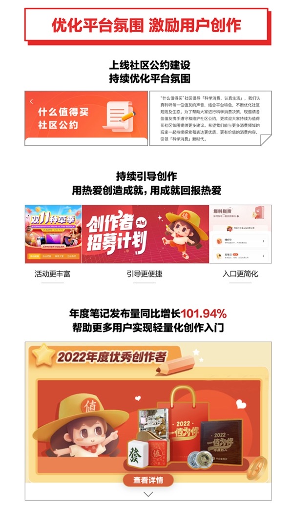 用戶是“什么值得買”最重要的根基,正是在數(shù)千萬用戶的積極分享之下,什么值得買才能形成用戶驅(qū)動的消費內(nèi)容創(chuàng)作生態(tài),讓來自用戶的真實聲音幫助更多用戶,實現(xiàn)良性循環(huán)。為了更好的服務用戶,什么值得買持續(xù)優(yōu)化平臺氛圍,10月份上線了社區(qū)公約建設,并持續(xù)推出“創(chuàng)作者招募計劃”、“種草季”等創(chuàng)作引導活動,調(diào)整了內(nèi)容發(fā)布入口簡化用戶發(fā)布邏輯,最終實現(xiàn)年度筆記發(fā)布量同比增長101.94%,幫助了更多用戶實現(xiàn)輕量化創(chuàng)作入門。