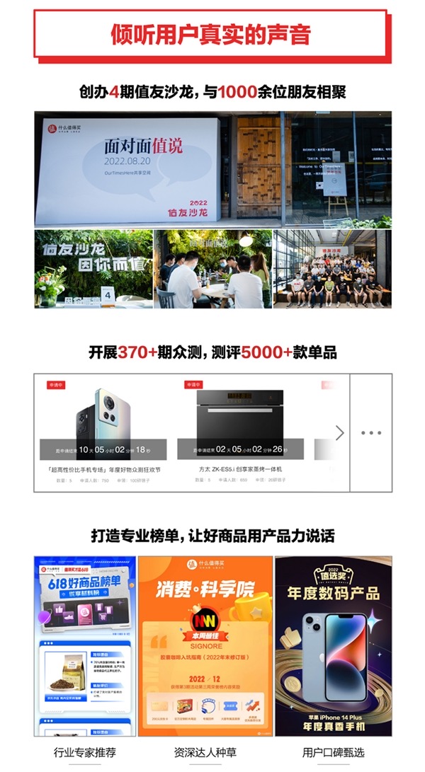 什么值得買致力于與用戶構(gòu)建深層次的互動關(guān)系,聆聽他們真實的反饋。2022年什么值得買舉行了4期值友沙龍,與1000余位值友暢談,并在值友的支持中改進產(chǎn)品與服務。與此同時,為消費者提供更多親身測評、交流感受的機會,全年開展370多期眾測,發(fā)布5000多款測評單品,給消費者帶去更多嘗新機會。此外,什么值得買重視每個消費者的選擇,將其視為當下消費市場的重要參考,多次推出由消費者票選的榜單,讓普通消費者與消費專家、行業(yè)編輯及KOL一起,從自身角度推舉值得推薦的好商品。