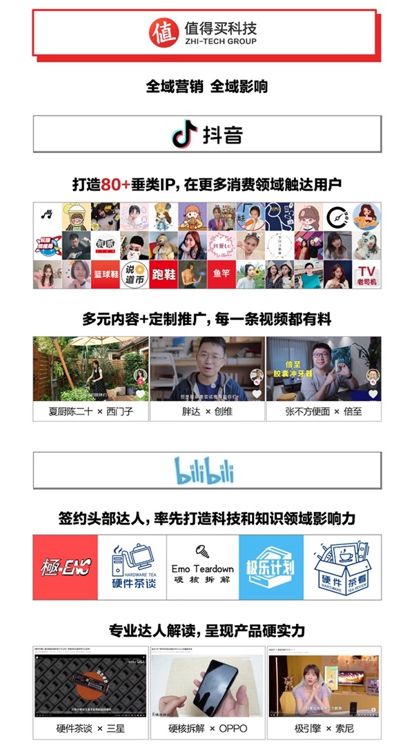以抖音平臺為例,值得買科技已通過旗下MCN打造79+垂類達人,并通過多元形式+定制化推廣,持續(xù)提升品牌營銷效果,目前已有夏廚陳二十X西門子、胖達X創(chuàng)維等多個成功案例;在B站也通過簽約科技、知識領(lǐng)域頭部達人,持續(xù)釋放內(nèi)容影響力,已實現(xiàn)單品牌營銷曝光量破百萬;聚值傳媒則幫助斯凱奇、安踏等品牌,在小紅書進行深度種草,目前話題總曝光量超過2500萬。