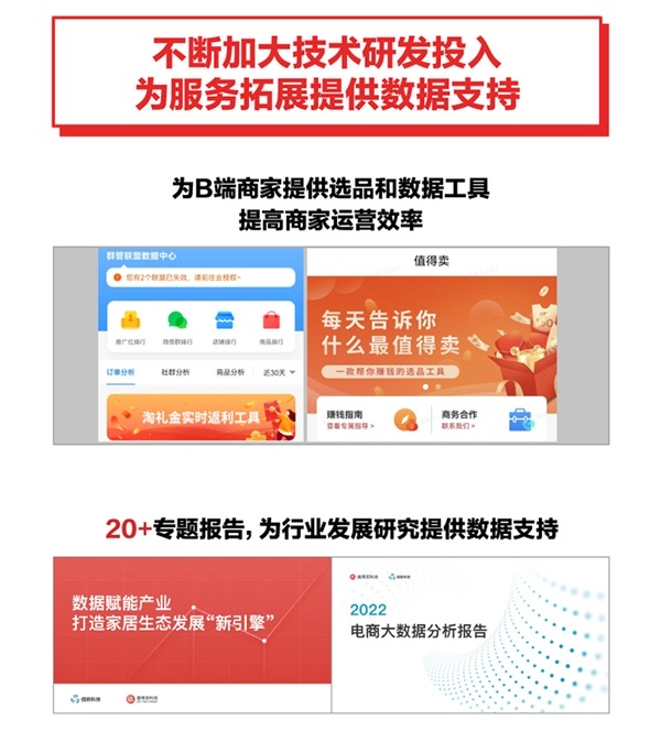 為了更好地提供服務,公司持續(xù)強化在核心領(lǐng)域的技術(shù)積累與研發(fā)應用能力,并積極輸出消費數(shù)據(jù)服務能力,以提升B端與C端的連接效率,推動整個消費產(chǎn)業(yè)的轉(zhuǎn)型升級和可持續(xù)發(fā)展。2022年度,值得買科技相繼推出《電商大數(shù)據(jù)分析報告》等20+行業(yè)報告,為行業(yè)發(fā)展研究提供數(shù)據(jù)支持,星羅也面向淘系淘客、京東推手新開發(fā)了流量端產(chǎn)品,提高了商家運營效率。