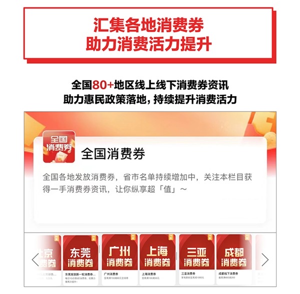 值得買科技的企業(yè)愿景是“創(chuàng)造消費信息自由流動的美好世界”,自然尤為重視信息流通的價值,并充分發(fā)揮自身優(yōu)勢,積極助力國家相關(guān)惠民政策的落地。其中,在國家消費券發(fā)放過程中,值得買科技便開設相關(guān)專欄并給予曝光資源推薦,安排專項行動組實時跟進匯總最新信息,匯集了全國80+地區(qū)的線上線下消費券信息,讓普惠信息切實傳遞至更多消費者。